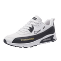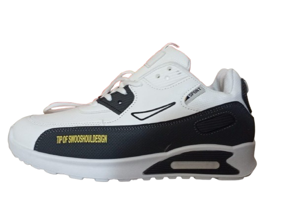 he SportX Air Runner 90 is a stylish and budget-friendly sneaker inspired by classic athletic designs. Featuring a durable synthetic upper in black and white with breathable mesh panels, it offers comfort and casual flair. The unique text detail "TIP OF SWOOSHOULDDESIGN" adds a quirky touch, making it stand out. Ideal for everyday wear, walking, or casual outings.