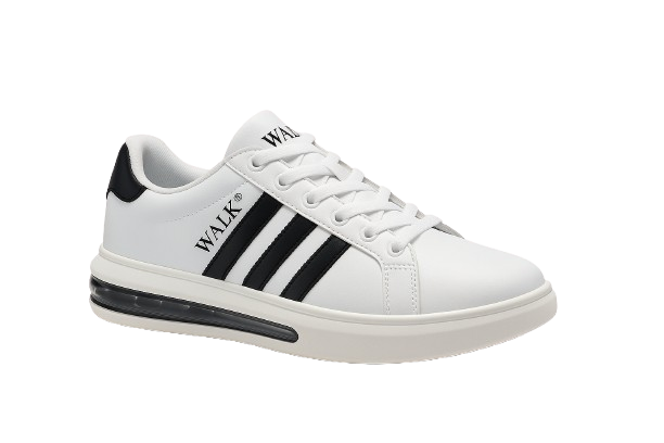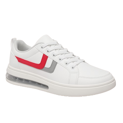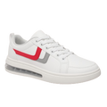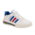 This sporty WALK® sneaker features a clean white base accented by bold red and blue side stripes for a vibrant, athletic look. Designed for comfort and everyday wear, the shoe includes a thick, cushioned sole with a visible air unit for added support. The collar is padded for extra ankle comfort, and the back is finished with a blue heel tab. Combining casual style with modern flair, this sneaker is perfect for walking, light activity, or casual streetwear.